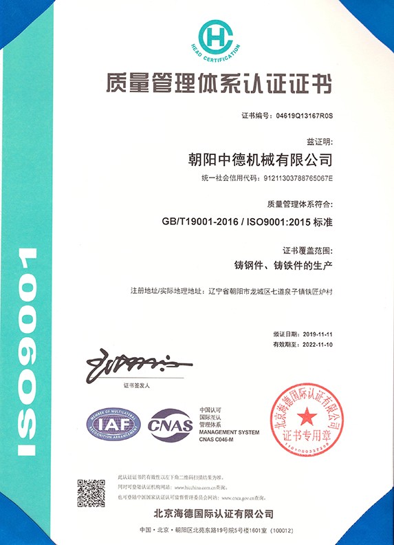 朝陽中德機械有限公司座落于有著“東方佛都”之稱的三燕古都,歷史文化名城——朝陽,具體位置朝陽市龍城區七道泉子鎮鐵匠爐村。公司創建于2006年5月是一家以鑄鋼件、鑄鐵件,集按用途設計、開發、生產、銷售于一體的,為機械設備配套的生產型公司。公司注冊資金1000萬,固定資產投資1480萬元,主要生產設備GGW-5T,GGW-10T,GGW-10T中頻感應爐;GDY-13C高溫電阻窯、GDY-9.5C電阻窯,M4000型直讀光譜儀,DP-3985型硬度測試儀,倒置式金相顯微鏡、拉伸試驗機、超生波探傷儀,檢測手段完備。